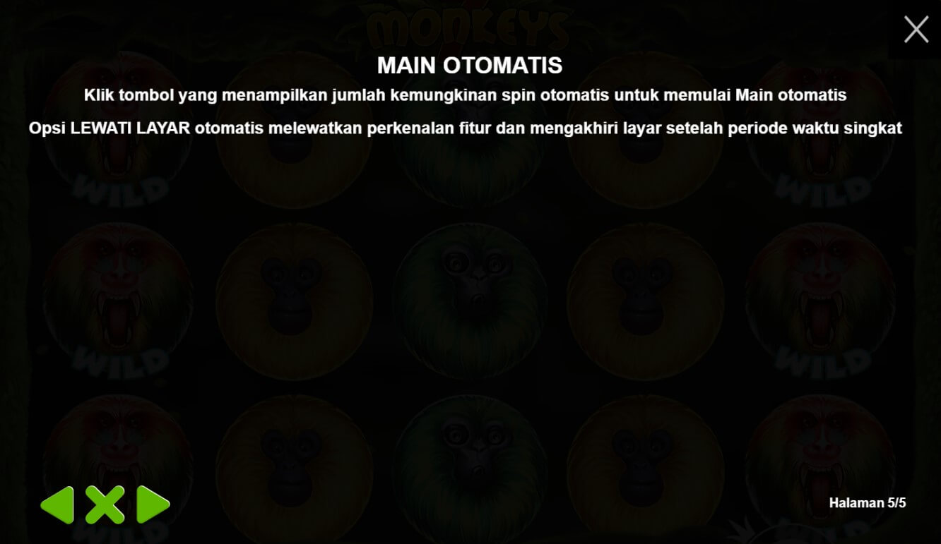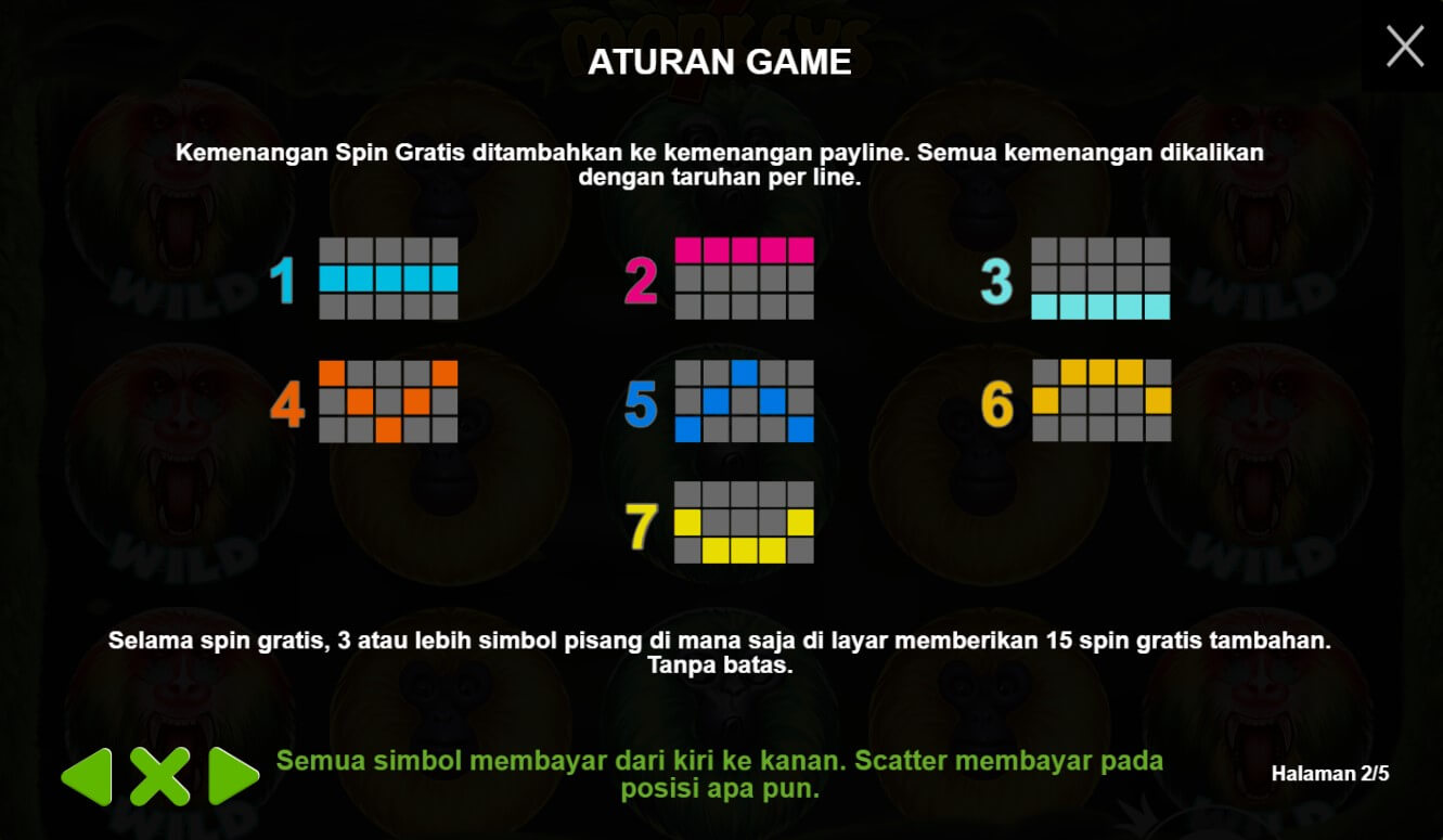 7 Monkeys adalah game slot yang dikembangkan oleh perusahaan perangkat lunak Pragmatic Play. Game ini mengusung tema hutan dan kehidupan monyet dengan tampilan yang cerah dan menggemaskan. 7 Monkeys menghadirkan nuansa hutan yang penuh dengan aktivitas monyet. Simbol-simbol dalam game ini mencakup berbagai jenis monyet, termasuk monyet emas, monyet putih, monyet merah, serta simbol-simbol buah-buahan seperti pisang, jeruk, anggur, dan simbol-simbol kartu remi yang dihiasi dengan elemen-elemen hutan.Game ini menggunakan format gulungan tradisional 5x3 dengan 7 jalur pembayaran yang tetap. Pemain akan mencoba mencocokkan simbol-simbol yang sesuai di jalur pembayaran untuk memenangkan hadiah. 7 Monkeys menawarkan fitur-fitur khusus seperti simbol liar (wild) yang dapat menggandakan kemenangan, putaran gratis dengan pengganda (multiplier), serta fitur "Super Wilds" yang secara acak mengubah simbol-simbol lain menjadi simbol liar.