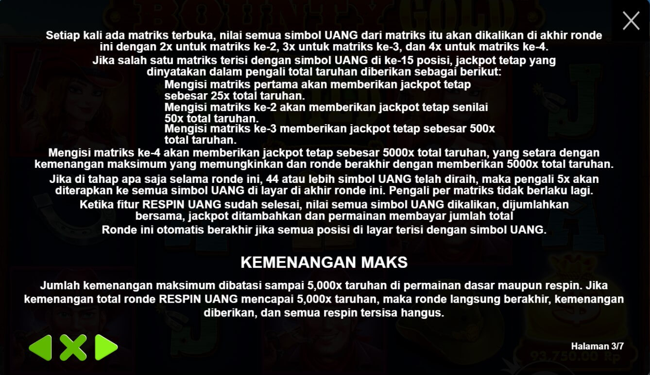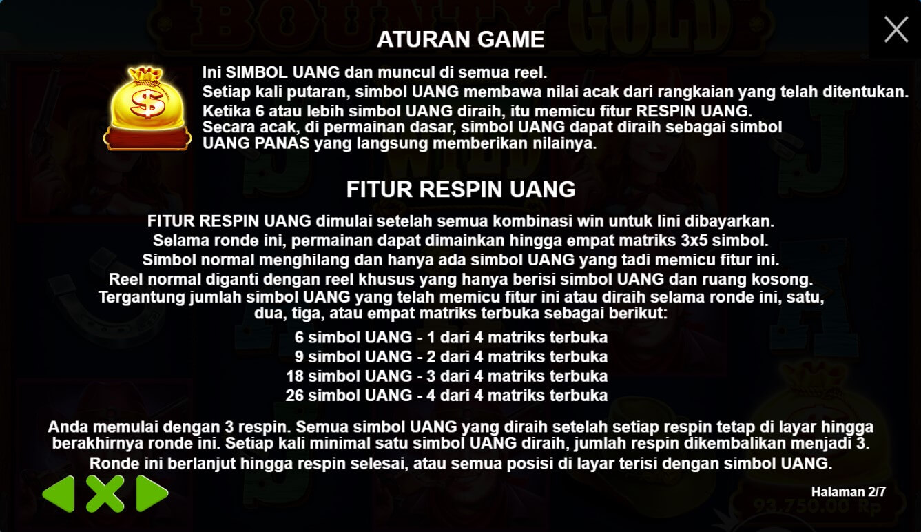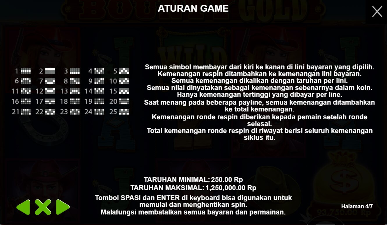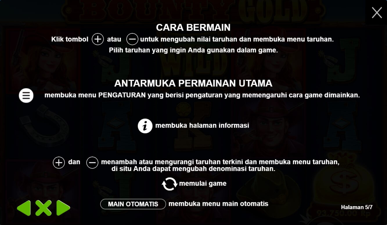 Bounty Gold adalah game slot bertema koboi yang menampilkan latar belakang kota koboi yang klasik dengan jalan berdebu dan toko-toko kuno. Game ini memiliki lima gulungan dan tiga baris dengan 10 jalur pembayaran. Simbol-simbol pada gulungan termasuk simbol-simbol koboi seperti topi koboi, pistol, dan sabuk, serta simbol-simbol standar seperti A, K, Q, J, 10, dan 9. Ada juga simbol wild yang dapat menggantikan simbol lain dan simbol scatter yang dapat memicu fitur bonus. Fitur-fitur yang tersedia pada game ini termasuk fitur Bounty Hunter, di mana pemain dapat memenangkan hadiah tunai ketika simbol bounty hunter muncul pada gulungan. Fitur ini juga memiliki empat level hadiah yang berbeda-beda, di mana level hadiah yang lebih tinggi akan memberikan hadiah tunai yang lebih besar. Ada juga fitur Free Spins yang dapat diaktifkan dengan tiga atau lebih simbol scatter pada gulungan, di mana pemain dapat memenangkan hingga 10 putaran gratis. Selain itu, ada juga fitur Respin yang dapat diaktifkan ketika simbol bounty hunter muncul pada gulungan. Dalam keseluruhan, Bounty Gold menawarkan pengalaman bermain game slot yang menyenangkan dengan tema koboi yang menarik. Artikel tentang game slot Bounty Gold dapat membahas tentang cara bermain, fitur-fitur yang tersedia, dan strategi yang dapat digunakan untuk meningkatkan peluang memenangkan hadiah dalam permainan ini.