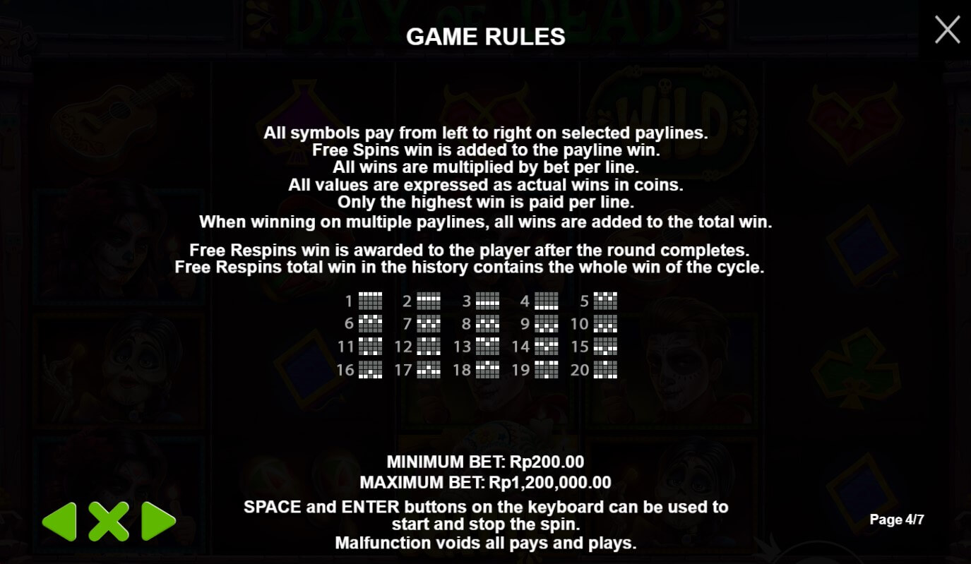 Day of Dead adalah judul yang terinspirasi oleh perayaan tradisional Meksiko yang dikenal sebagai Día de los Muertos atau Hari Orang Mati. Perayaan ini dirayakan dengan cara menghormati dan mengenang para leluhur yang telah meninggal. Beberapa penyedia perangkat lunak kasino online, seperti IGT, telah mengembangkan game slot dengan tema "Day of Dead". Dalam permainan ini, Anda akan menemukan simbol-simbol yang terkait dengan perayaan tersebut, seperti tengkorak berwarna-warni, bunga marigold, kerangka, serta karakter-karakter khas seperti La Catrina. Game slot Day of Dead biasanya memiliki tampilan yang cerah dengan lima gulungan dan beberapa garis pembayaran. Beberapa fitur khusus yang mungkin ditemukan dalam permainan ini termasuk Wild Symbol yang dapat menggantikan simbol lain, Scatter Symbol yang dapat memicu putaran gratis, serta fitur bonus tambahan yang menambah keseruan permainan.