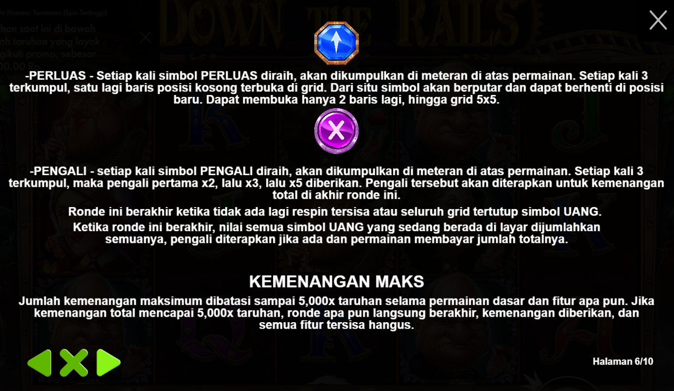 Down the Rails. Slot yang sangat fluktuatif ini memiliki 20 saluran pembayaran tetap dan RTP 96,51%. Menangkan hingga 5.000x taruhan Anda dengan lima pengubah permainan dasar acak, lima putaran putaran gratis, dan banyak lagi. Siap untuk memulai? Kemudian mainkan slot Down the Rails online hari ini! Dengan hadiah hingga 2.500 koin, simbol liar adalah simbol pembayaran tertinggi. Ini diikuti oleh bangsawan, bos mafia, penulis, wanita, dan guru. Simbol pembayaran yang lebih rendah dari mesin slot Down the Rails turun dari A ke K, Q, dan J.