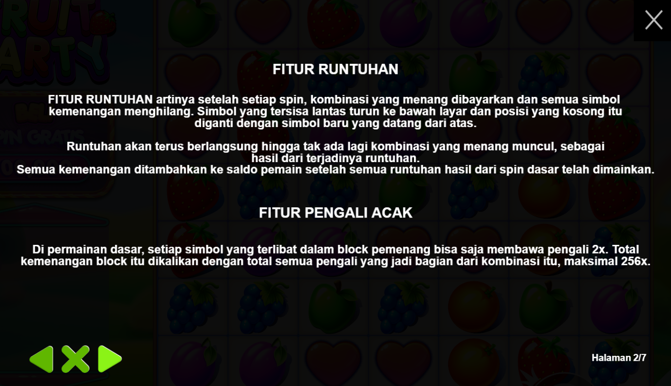 Fruit Party adalah salah satu permainan slot online yang dikembangkan oleh Pragmatic Play. Seperti namanya, tema utama game ini adalah buah-buahan, dengan simbol-simbol seperti ceri, anggur, stroberi, dan buah-buahan lainnya. Game slot Fruit Party memiliki format 7x7, yang berarti ada 7 kolom dan 7 baris simbol. Pemain dapat memenangkan hadiah dengan mencocokkan setidaknya lima simbol yang sama secara horizontal atau vertikal. Ada juga fitur khusus dalam permainan ini, seperti simbol liar dan fitur "Tumble", di mana simbol-simbol menurun dari atas layar dan menggantikan simbol-simbol sebelumnya untuk membuka peluang kemenangan baru. Fruit Party juga memiliki fitur putaran gratis, di mana pemain dapat memenangkan putaran tambahan dengan tiga atau lebih simbol pencar. Selama putaran gratis, simbol-simbol dapat berlipat ganda untuk meningkatkan peluang kemenangan.