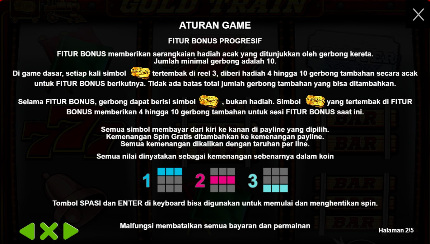 Gold Train adalah permainan kasino online yang memiliki tema kereta api dan pencarian harta karun. Dalam permainan ini, Anda akan menemui simbol-simbol yang terkait dengan tema tersebut, seperti kereta api, koin emas, lonceng, loker, dan simbol-simbol lain yang terkait dengan perjalanan kereta api dan kekayaan. "Gold Train" biasanya menawarkan grafis yang menggambarkan kereta api dan lanskap perjalanan dengan efek suara yang sesuai. Fitur-fitur bonus yang umum dalam permainan ini termasuk putaran gratis dengan pengganda kemenangan, simbol-simbol liar yang dapat menggantikan simbol lain, serta fitur-fitur tambahan seperti respin, jackpot progresif, atau fitur khusus yang terkait dengan tema kereta api. Rincian permainan seperti jumlah gulungan, payline, persentase pengembalian ke pemain (RTP), dan fitur-fitur khusus lainnya dapat bervariasi tergantung pada penyedia perangkat lunak dan versi permainan "Gold Train" yang Anda mainkan. "Gold Train" adalah salah satu dari banyak judul permainan slot yang dapat ditemukan di berbagai kasino online.