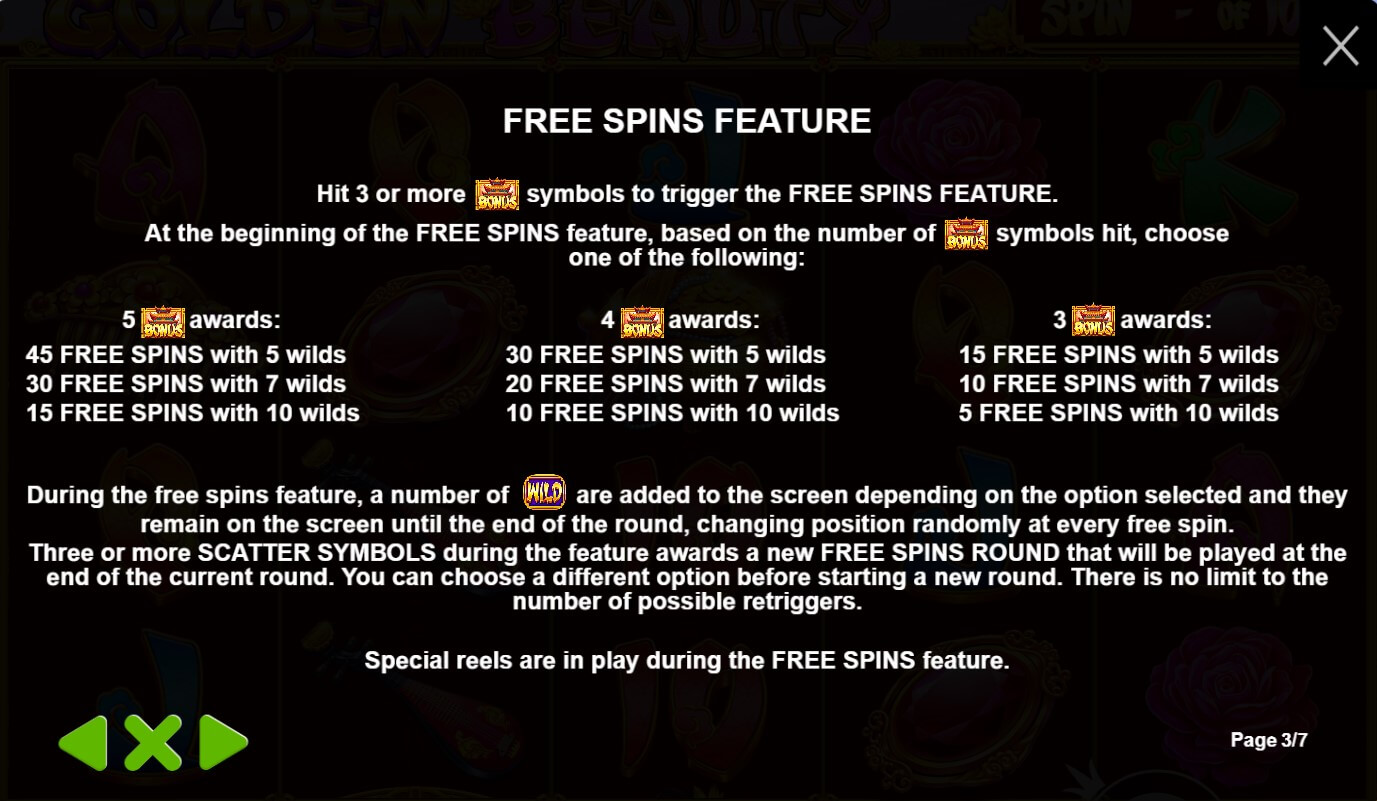 Golden Beauty adalah sebuah game slot online yang dikembangkan oleh Pragmatic Play. Game ini memiliki lima gulungan dan tiga baris dengan 75 garis pembayaran. Tema dari game ini adalah budaya Asia, dan simbol-simbolnya termasuk ikon khas Asia seperti bangunan-bangunan tradisional, bunga-bunga, serta angka dan huruf dalam gaya tulisan Asia. Pemain dapat memasang taruhan dengan nilai koin yang berbeda-beda dan memicu fitur bonus "Progressive Multiplier Free Spins". Fitur ini memberikan putaran gratis dengan pengganda bertingkat. Setiap putaran gratis memiliki pengganda yang lebih tinggi daripada putaran sebelumnya, mulai dari 1x dan meningkat hingga 50x. Selain itu, game ini juga memiliki fitur simbol liar yang dapat menggantikan simbol lain untuk membentuk kombinasi pemenang dan meningkatkan peluang pemain untuk memenangkan hadiah besar. Golden Beauty juga menawarkan fitur "Ante Bet" yang memungkinkan pemain untuk memicu fitur bonus dengan memasang taruhan yang lebih tinggi. Keseluruhan, Golden Beauty menawarkan pengalaman permainan yang sederhana namun mengasyikkan dengan potensi hadiah besar yang dapat dimenangkan oleh para pemain, serta grafis yang indah dan efek suara yang menghibur.