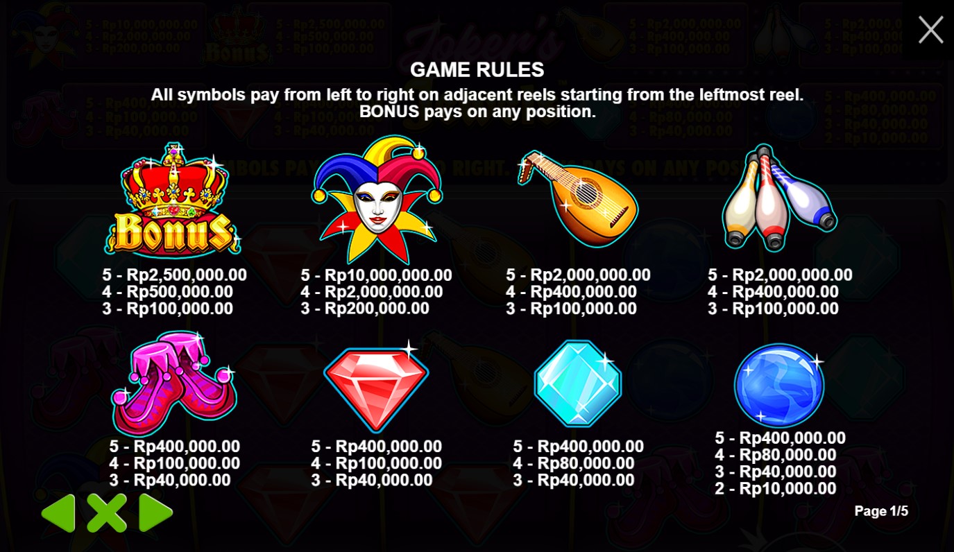 Jokers Jewels adalah sebuah permainan slot online yang dikembangkan oleh Pragmatic Play. Permainan ini memiliki 5 gulungan dan 3 baris, serta 5 garis pembayaran tetap. Tema permainan ini adalah kegembiraan sirkus dan simbol-simbol yang digunakan termasuk jester (pelawak), mahkota, tongkat sulap, dan sebagainya. Permainan ini memiliki fitur bonus yang sederhana namun mengasyikkan, yaitu hanya menggunakan simbol jester sebagai simbol bonus. Simbol jester dapat membayar kemenangan yang besar dengan hanya dua atau lebih simbol yang cocok pada garis pembayaran yang aktif. Selain itu, permainan ini juga tidak memiliki simbol liar atau putaran gratis. Jokers Jewels adalah permainan slot yang sederhana dan mudah dimainkan, cocok bagi pemain yang mencari pengalaman bermain yang ringan dan tidak membingungkan. Namun, perjudian online harus dilakukan dengan bijak dan bertanggung jawab, dan pemain harus selalu membatasi jumlah uang yang mereka pertaruhkan sesuai dengan kemampuan keuangan mereka.