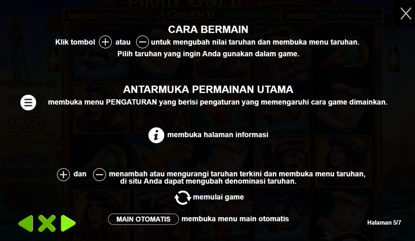 Game slot Pirate Gold Deluxe adalah permainan kasino online yang memiliki tema bajak laut yang seru. Dalam permainan ini, Anda akan memasuki dunia bajak laut dengan simbol-simbol yang terkait dengan tema tersebut, seperti kapal bajak laut, harta karun, belantara laut, pistol, dan karakter bajak laut. "Pirate Gold Deluxe" biasanya menawarkan grafis yang menarik dengan detail visual yang menghidupkan suasana kapal bajak laut dan petualangan di lautan. Fitur-fitur bonus yang umum dalam permainan ini termasuk putaran gratis dengan pengganda kemenangan, simbol Wild yang dapat menggantikan simbol lain untuk membantu menciptakan kombinasi kemenangan, serta fitur-fitur tambahan seperti respin, jackpot progresif, atau bonus game yang terkait dengan tema bajak laut. Setiap pengembang permainan dapat memiliki variasi dan fitur tambahan yang berbeda dalam permainan "Pirate Gold Deluxe". Oleh karena itu, rincian spesifik permainan ini, seperti jumlah gulungan, payline, persentase pengembalian ke pemain (RTP), dan fitur-fitur khusus lainnya, dapat bervariasi tergantung pada penyedia perangkat lunak dan versi permainan yang Anda mainkan.