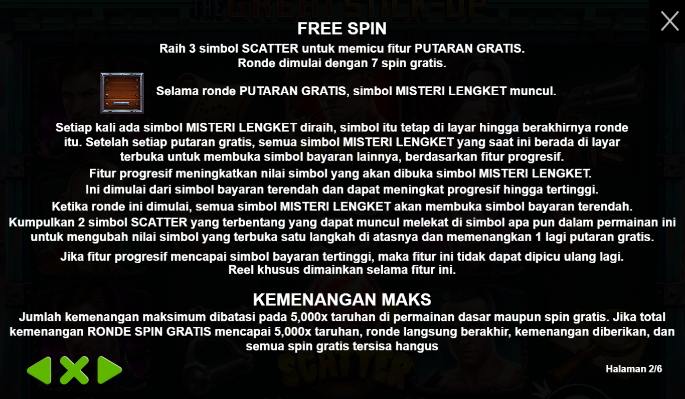 The Great Stick-Up adalah slot yang dikembangkan oleh studio Pragmatic Play yang diakui. Dirilis pada 19.05.2022 itu menjadi hit di kalangan penggemar slot karena mesinnya yang imersif dan karya seni yang luar biasa. Ulasan ini menjelaskan semua karakteristik utamanya yang bersama dengan mode demo gratis yang tersedia di clashofslots.com memberikan gambaran lengkap tentang pengalaman yang akan Anda dapatkan. The Great Stick-Up adalah slot bertema kejahatan dengan fitur yang menguntungkan. Lapangan bermain slot The Great Stick-Up, terdiri dari lima gulungan dan 20 baris, terletak dengan latar belakang kota kecil Amerika. Simbolisme slot The Great Stick-Up sesuai dengan temanya, artinya di reel Anda akan bertemu bandit dan yang bertarung dengan mereka yaitu detektif (simbol liar).